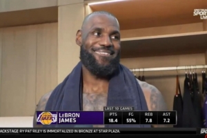 詹姆斯:“相比前几年,今年和去年我有更多能享受当下的时刻。这种感觉很酷,到了职业生涯的这个阶段,我依然能打出这样的表现,这让我觉得很不可思议,也让我感到谦逊。我只是努力投入训练,持之以恒,而这些数据就是努力的结果。”
