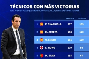 埃梅里2022年11月执教维拉以来英超主帅胜场排名(所有赛事):